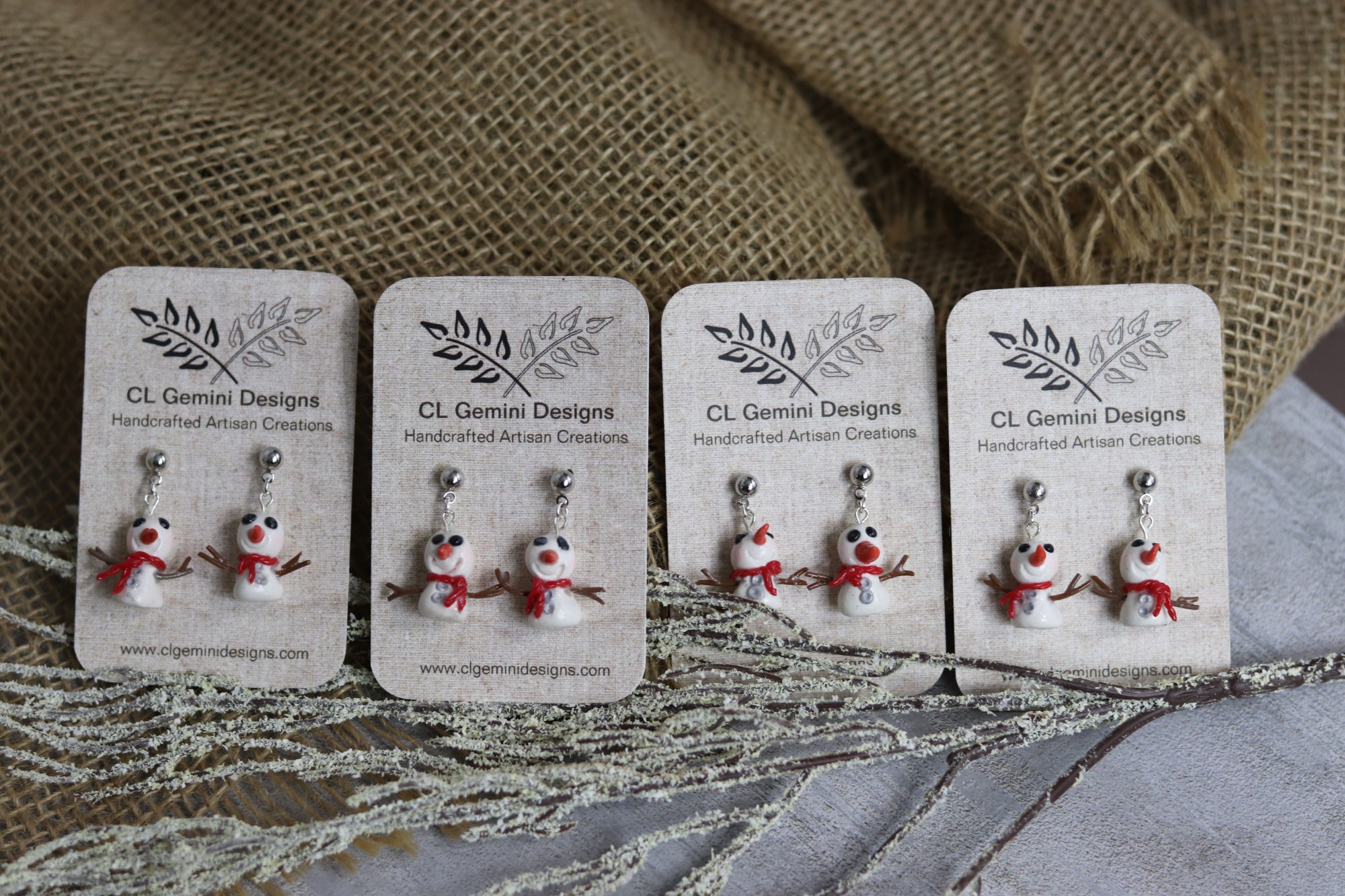 Bring a little snowfall to your outfit. Each snowman is hand-sculpted from lightweight polymer clay, finished with a glossy seal, and paired with silver ball studs for an easy, everyday drop. Tiny details—carrot noses, twig arms, and knit-style scarves—make every pair one-of-a-kind.