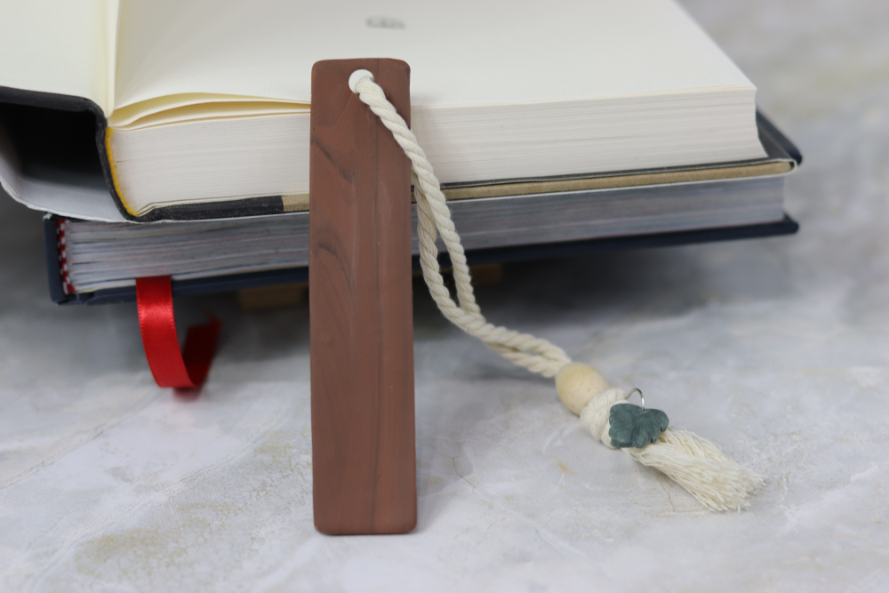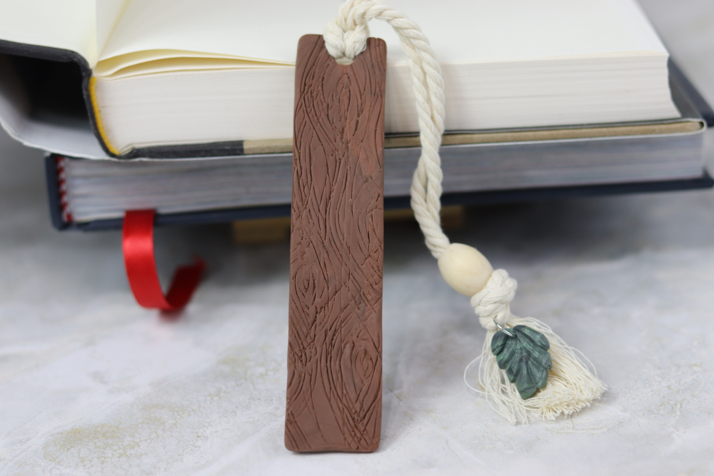 Handcrafted polymer clay bookmark with woodgrain texture, rope tassel, bead, and green leaf charm.
