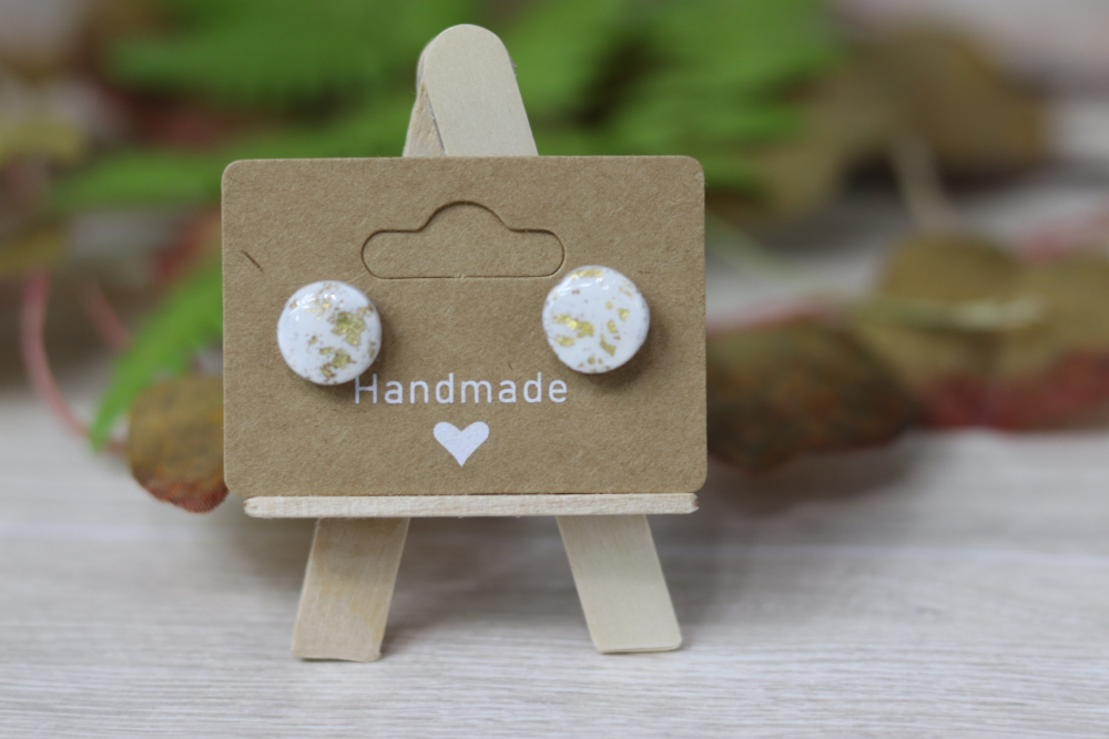 Minimalist yet eye-catching, these handcrafted polymer clay stud earrings feature a crisp white base accented with delicate gold foil detailing. Lightweight and versatile, they’re perfect for everyday wear or adding a subtle shimmer to a dressier look.